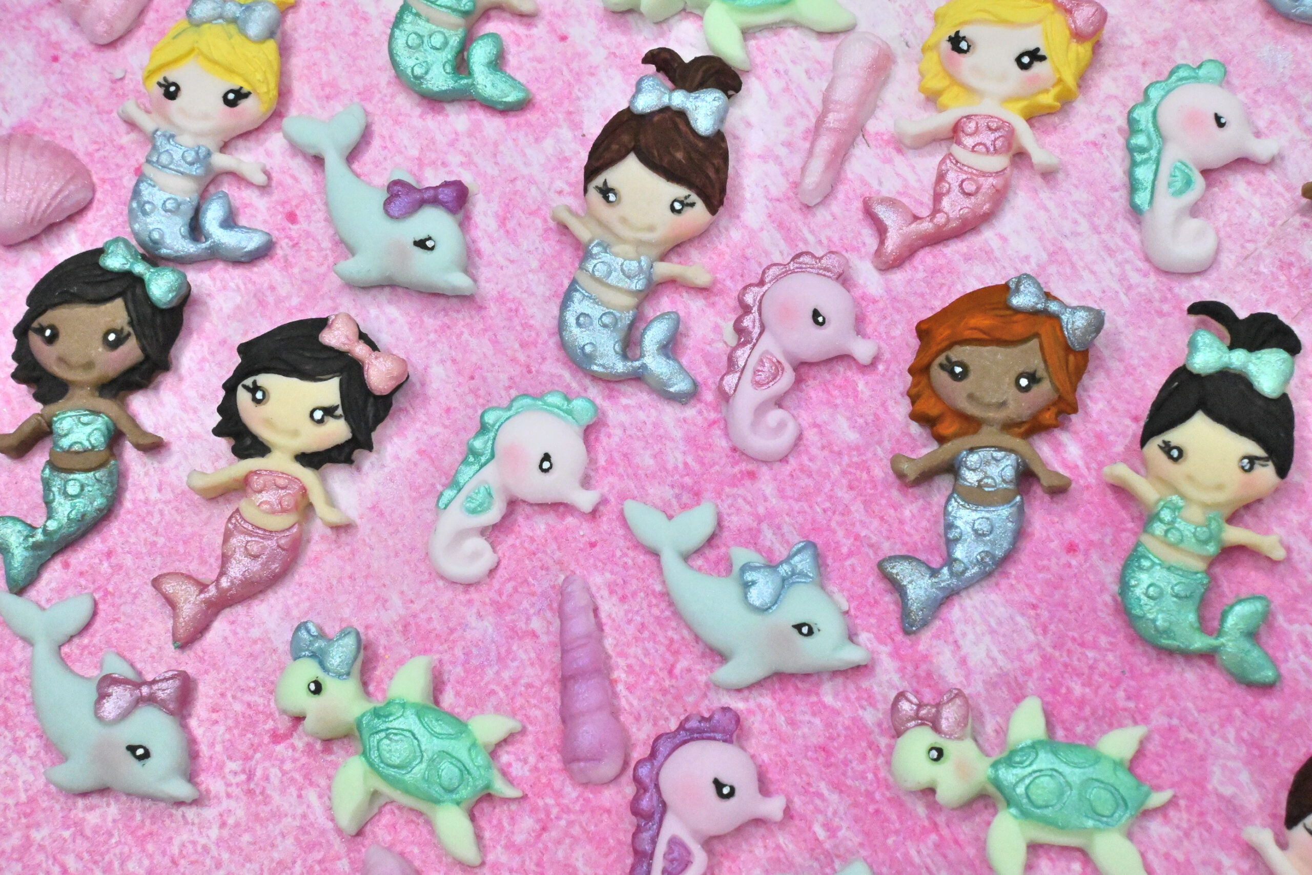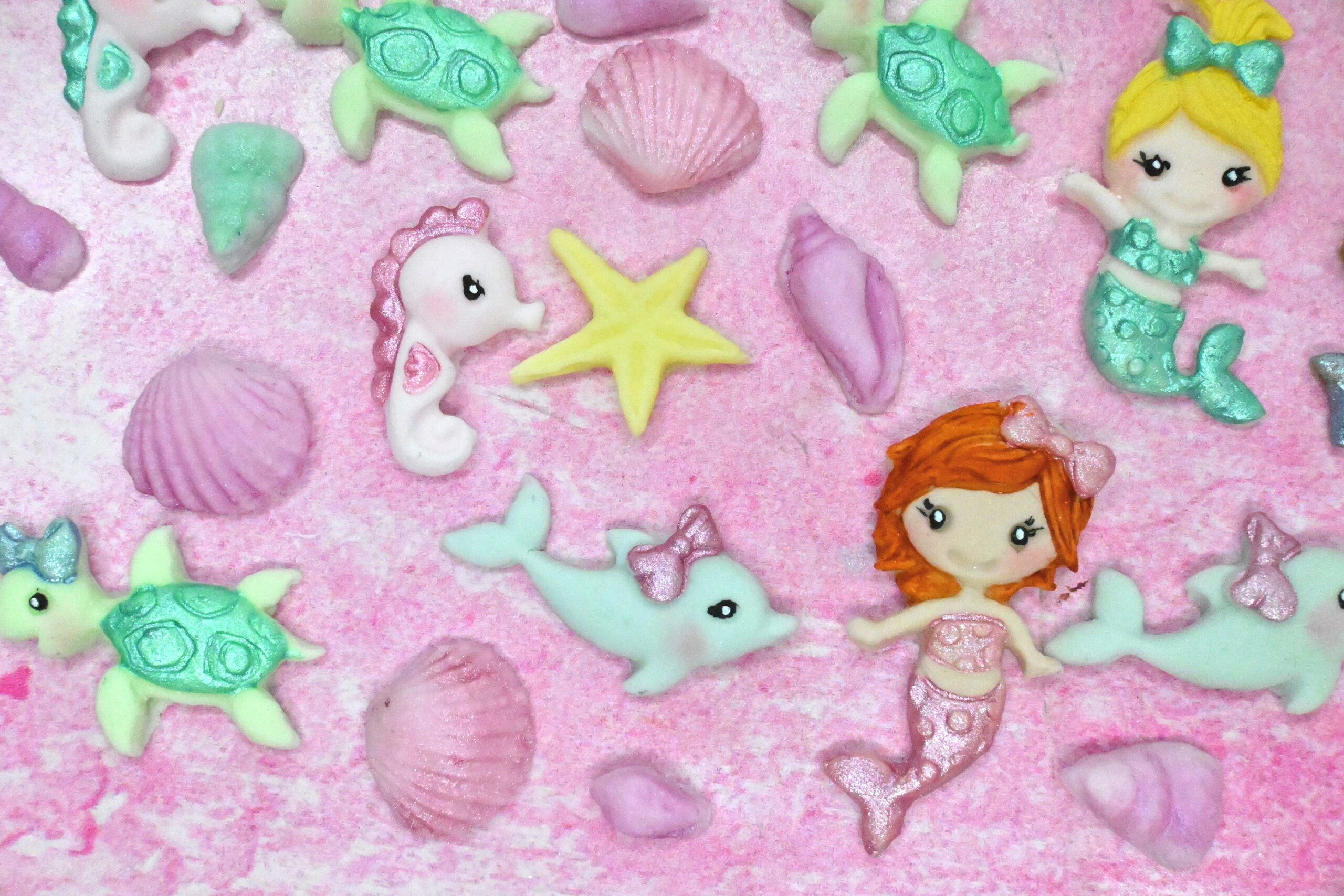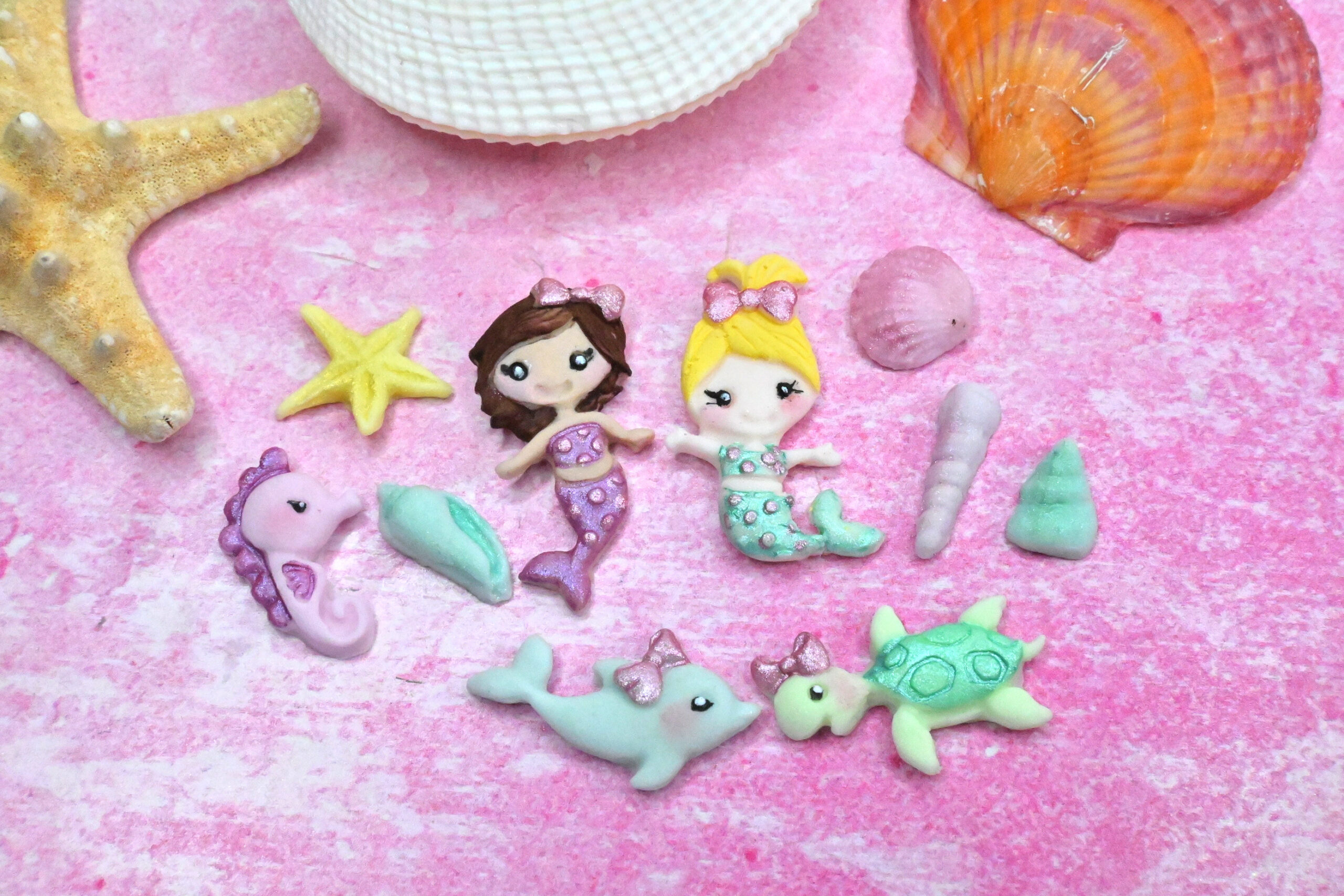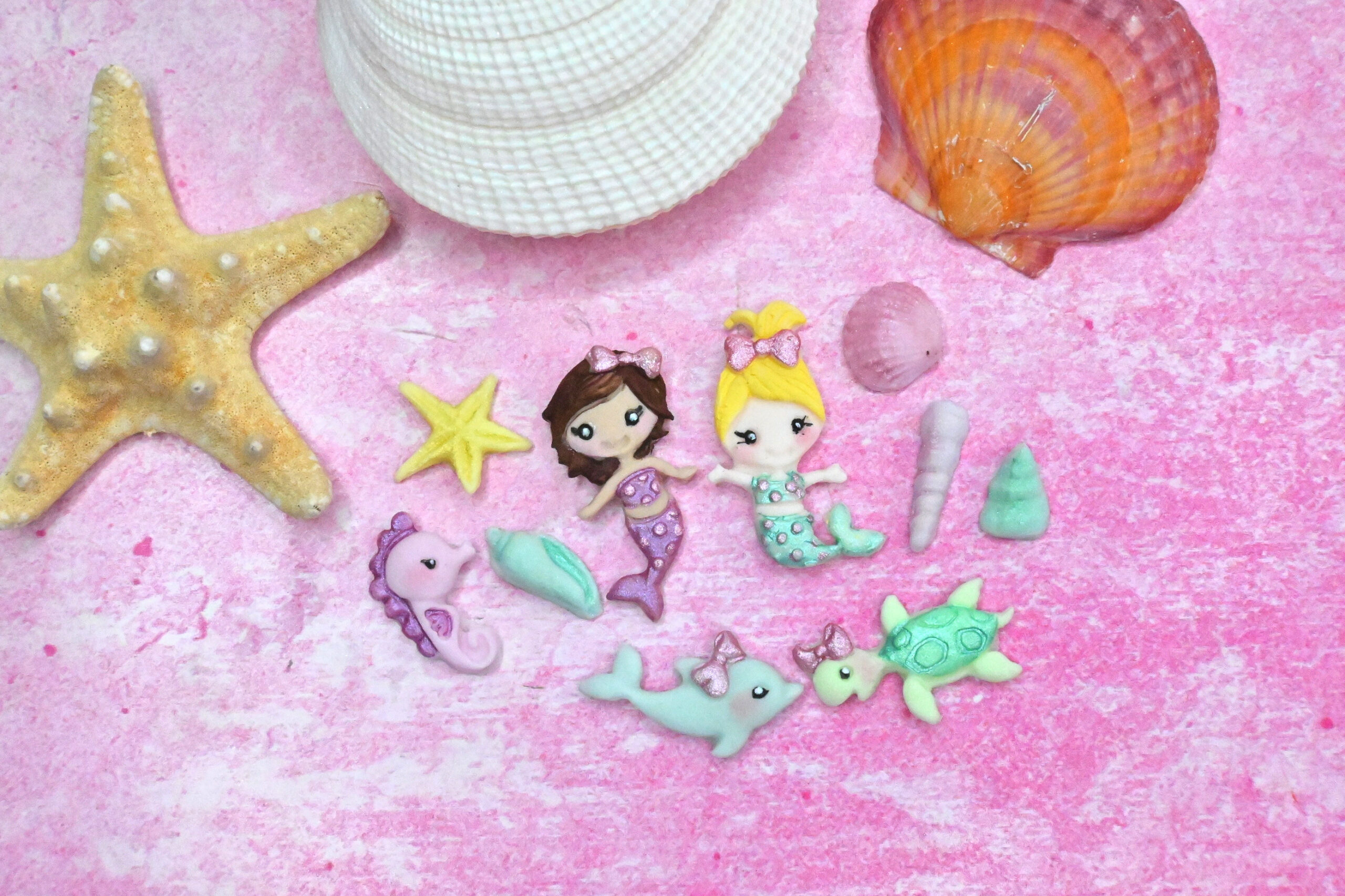 Giving you two mermaids, dolphin, seahorse, turtle, starfish and five shells.