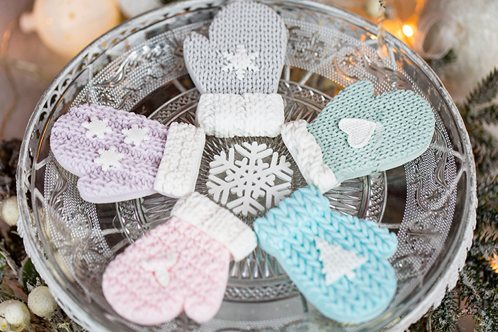 - Mould a trim for your mittens using one of our various knit/crochet effect moulds. In the video above we have used the trim from our Knitted Piece Mould. Measure it against the cuff of your mitten before trimming to size with a cutting wheel and attaching with edible glue. You can also make trims using any of the other moulds in our knit & crochet range.